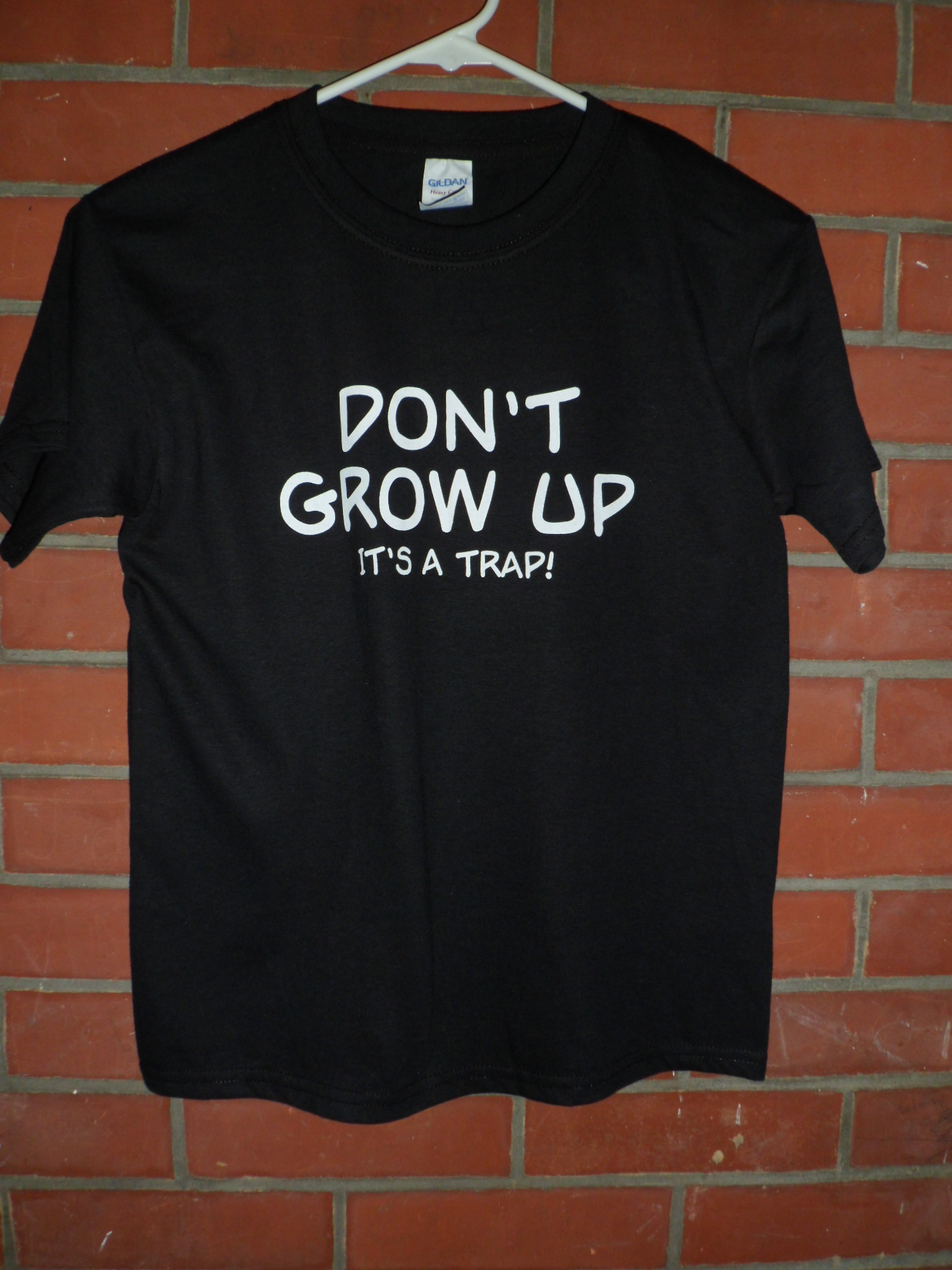 "Don't grow up it's a trap!' 100% preshrunk cotton.